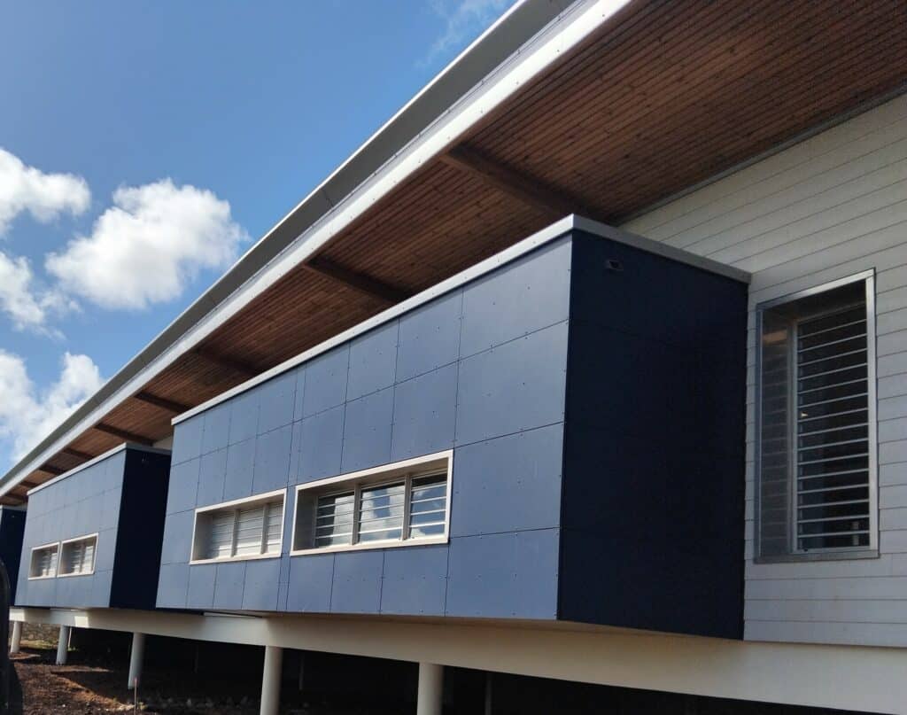Les façades, quant à elles, associent bardage bois et parements rapportés, contribuant à une architecture à la fois accueillante, lisible et cohérente, en lien avec la fonction éducative du bâtiment.
